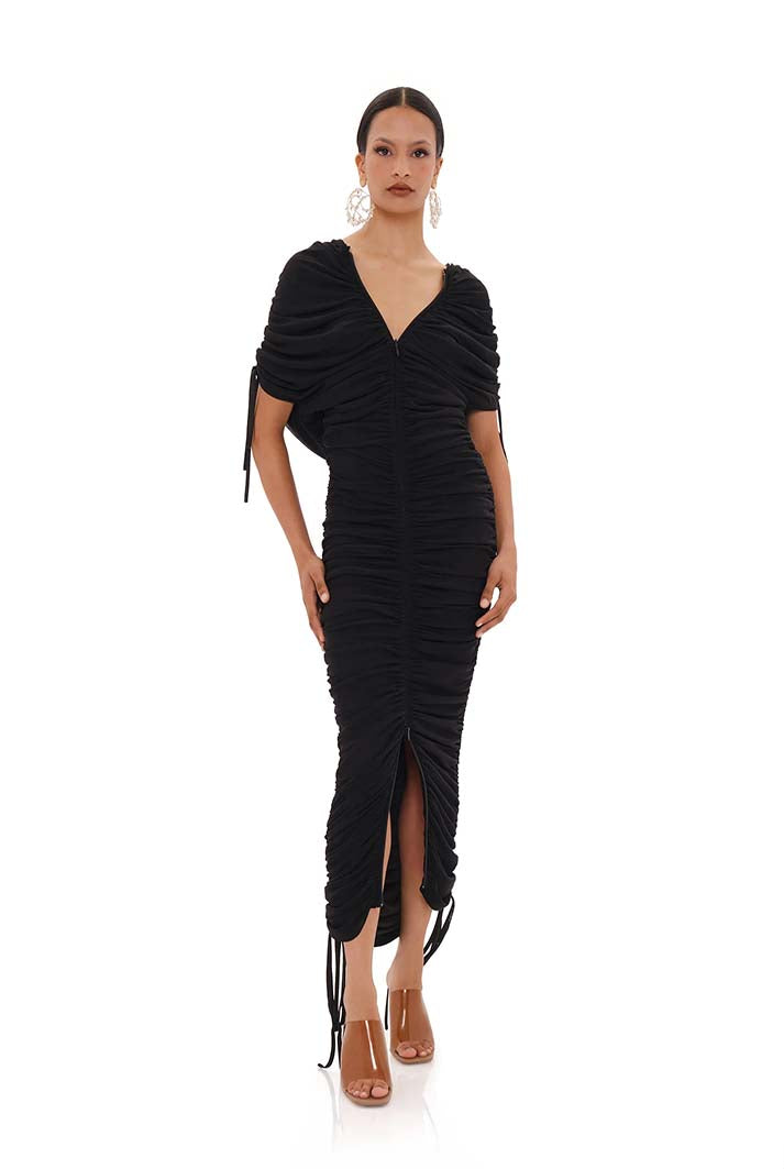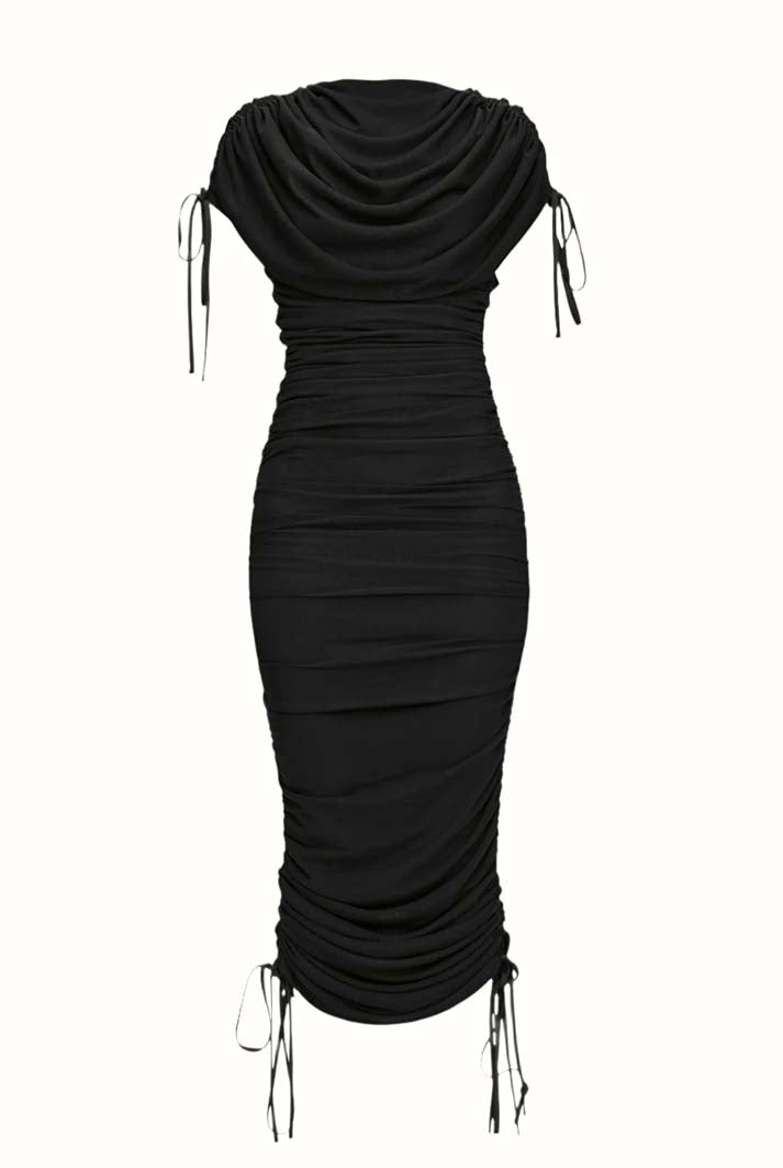 Made with layers of plush mesh is the RATU mesh dress. This midi length, boat neckline, bodycon dress with functional drawstrings is the mesh dress to own. The gathers accentuate the feminine curves beautifully without the concerns of a traditional bodycon dress. Wear it with the zip front for a V neck line style.
