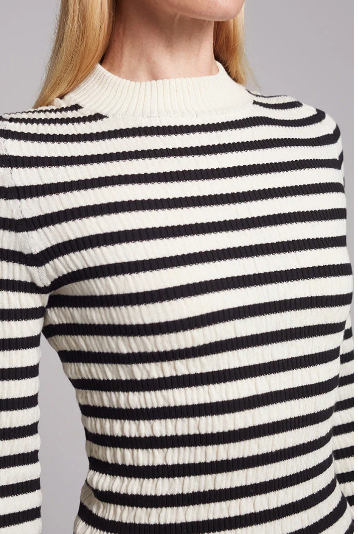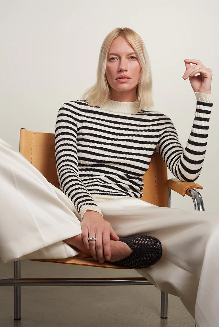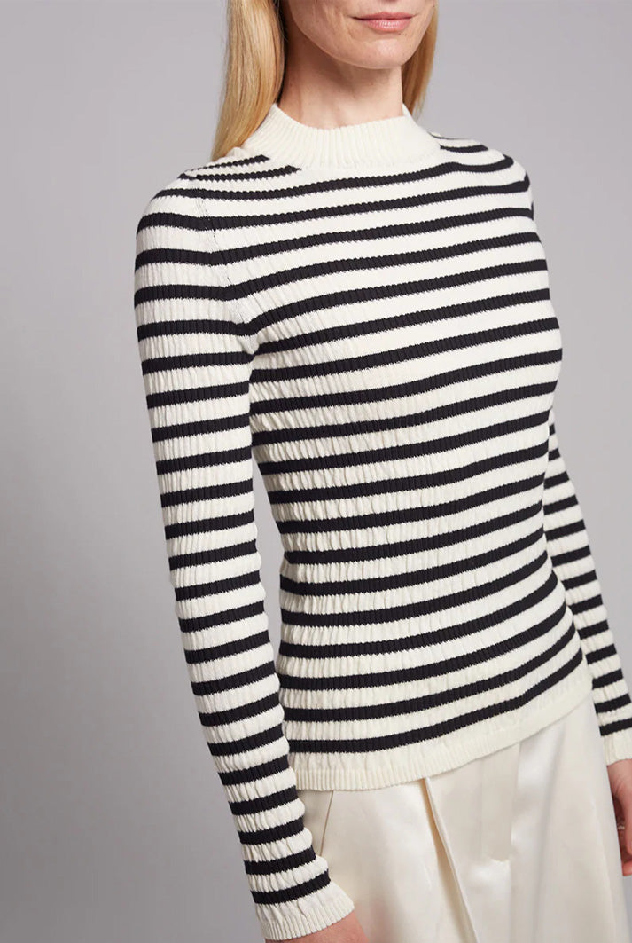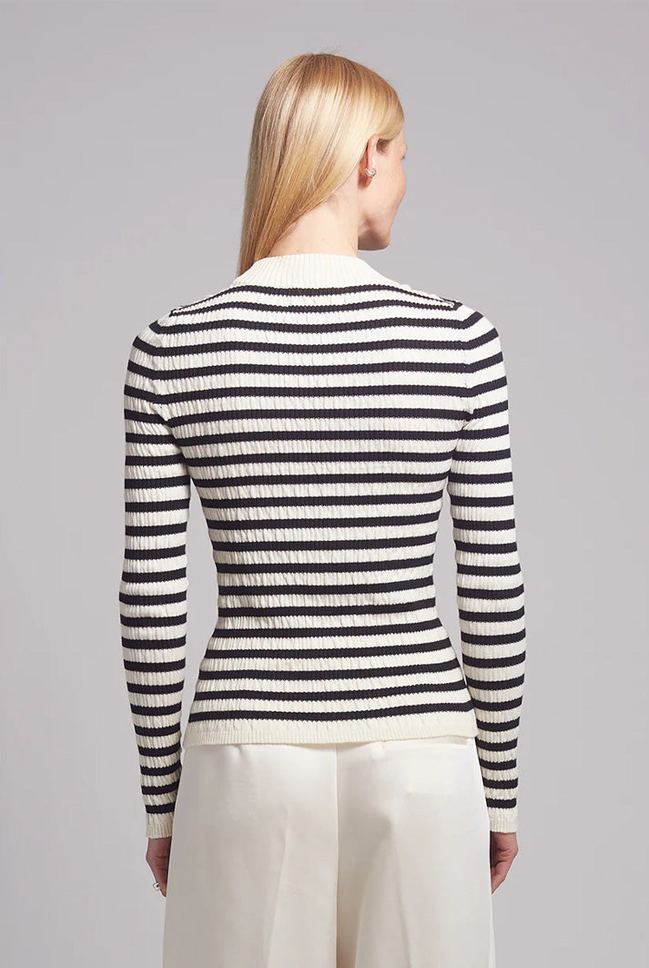 Clara is a slim, mock-neck sweater-top. This piece has a feminine seersucker, texture-stitch in a classic stripe that makes for day to night dressy outfit staple.
