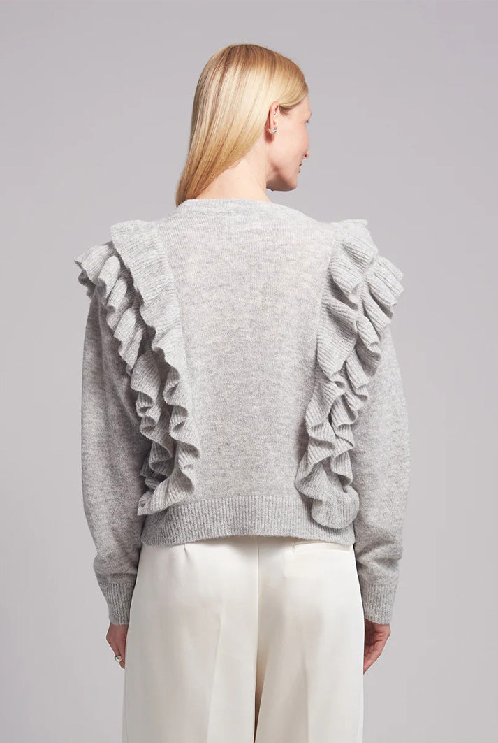 Elina is an emotional, must-have relaxed sweater with feminine yet relaxed double ruffle detail placed on shoulder and side body. Knit with the softest air-spun alpaca yarn in a light weight jersey stitch. This piece can be styled in a relaxed or dressier way, whatever your mood!