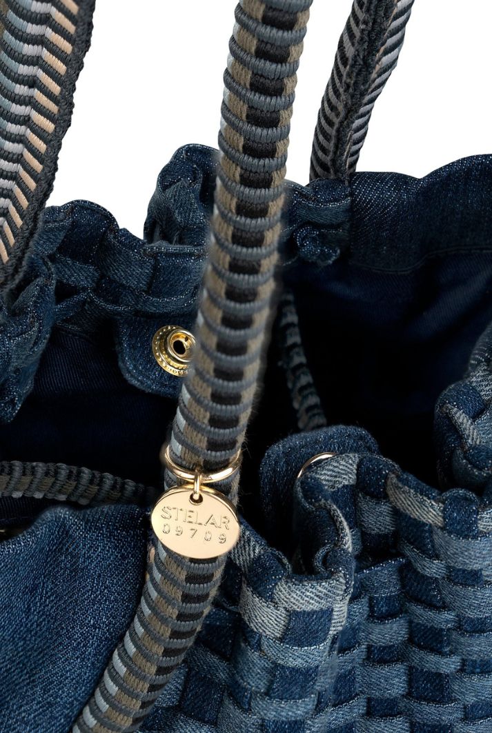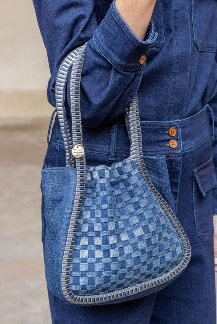 Its unique handwoven denim panels on each side gather along the top for a soft, pleated shape, while piped jacquard handles wrap elegantly around the body, adding both structure and texture. Inside, multiple compartments keep your essentials organized — from your phone to your iPad, while a press-stud top closure secures your belongings.