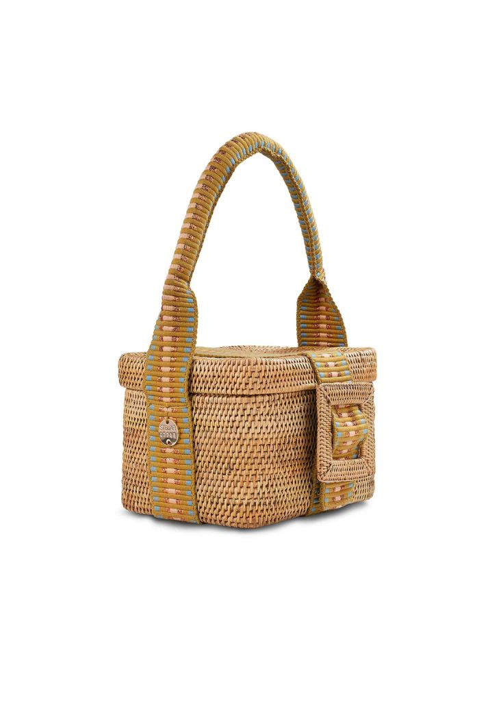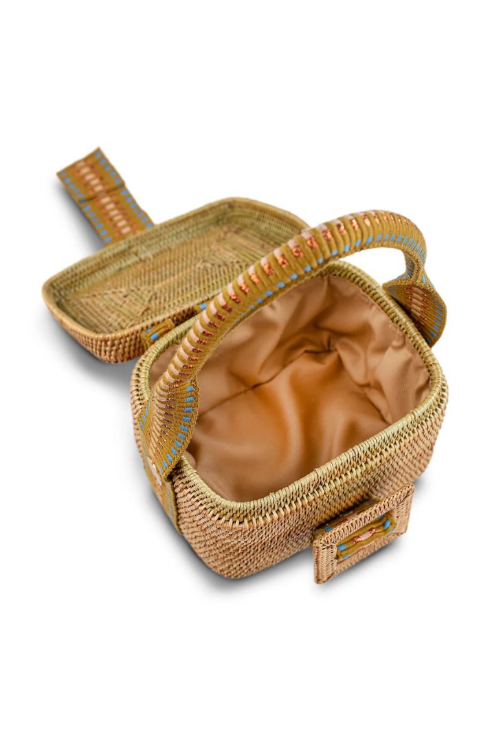 The hinged lid opens to reveal a fully lined cotton canvas interior, while the atta buckle and copper-striped jacquard strap add a distinctive design detail. Its compact shape and structured handle make it a perfect choice for daytime elegance or evening sophistication.