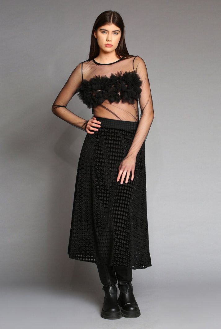 Striking and ethereal, the Black Sheer Tulle Top with 3D Floral Appliqués is designed to captivate. Crafted from a single layer of fine tulle, this blouse features sculptural floral appliqués across the bust, creating a dramatic focal point that balances delicacy with bold artistry.