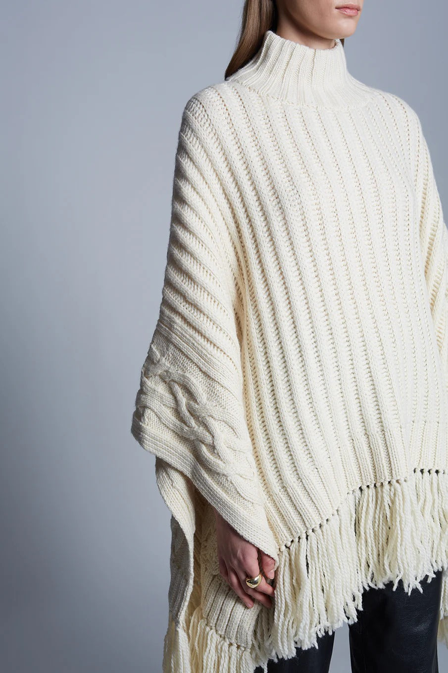 Hanni is a statement making true poncho with modern rib and cable boarder stitch finished with a dramatic fringe at the hem and mock neck. Layer her over a finer layer sweater as true Fall layering piece. Ethically made by artisans in Peru with sustainable yarns.
