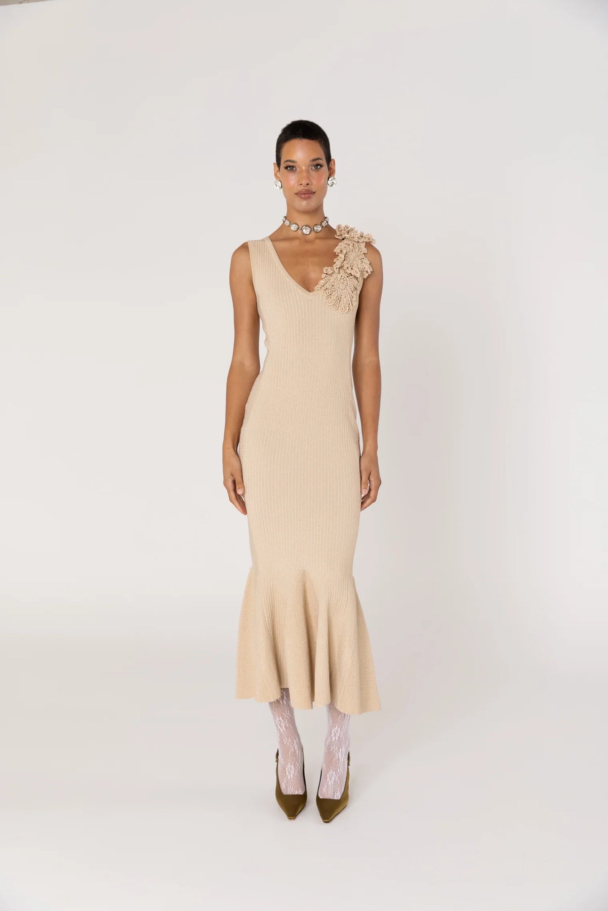 Step into refined glamour with the Beige Metallic Knit Midi Dress, a statement of subtle shimmer and modern femininity. Crafted from a soft beige metallic yarn with hints of viscose and lurex, it glimmers beautifully in the light while maintaining a comfortable, body-skimming fit.