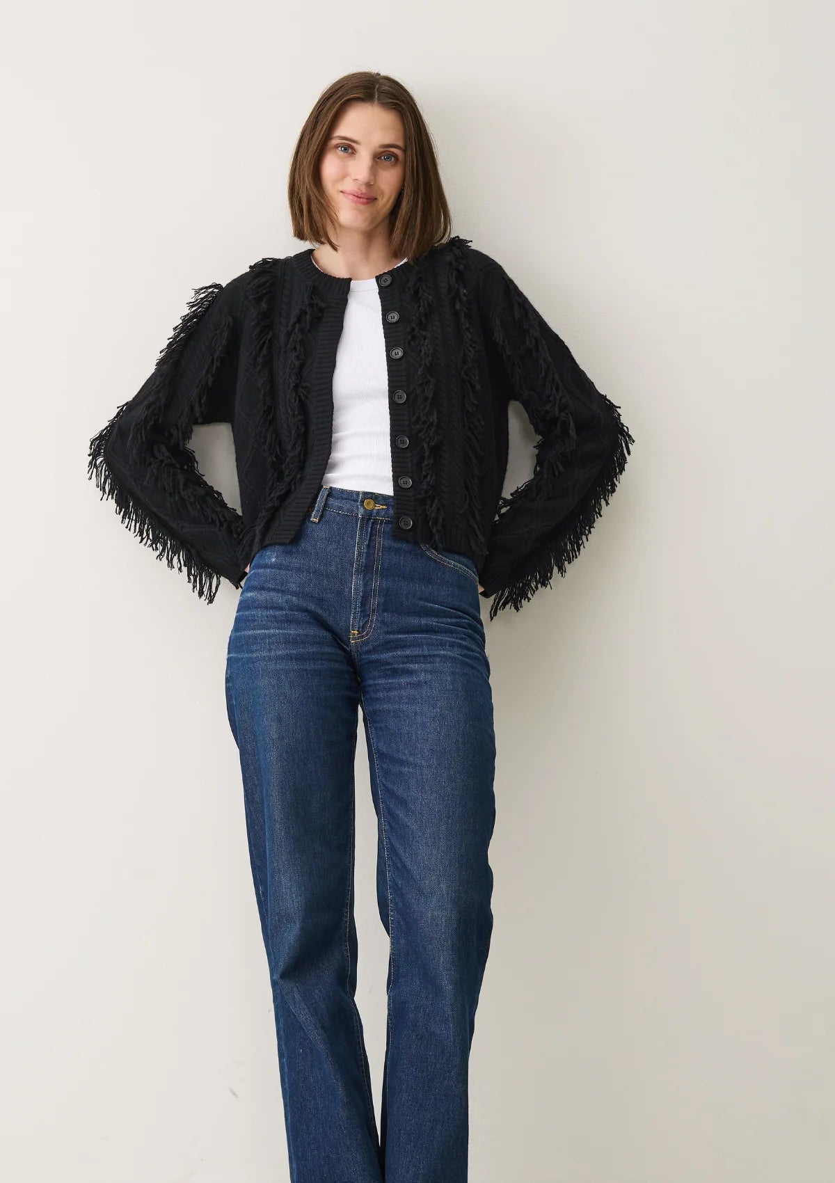 The fringed cable cashmere jacket in black is a classic reimagined — a piece that effortlessly combines timeless sophistication with modern texture. Crafted from sumptuous sustainably sourced Mongolian cashmere, this jacket offers both warmth and elegance, making it a true buy-now, wear-forever staple.