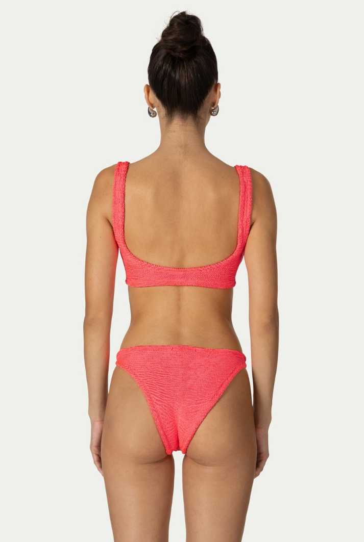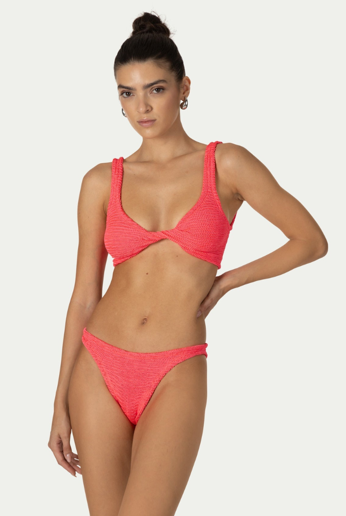 Elegantly crafted from highly stretchable, premium fabric, the DONIKA swimsuit set is designed to flatter a wide range of body types - from size XS to 2XL. The top is distinguished by a graceful twist detail that enhances the décolletage with understated sophistication, while the dual shoulder straps provide gentle support and refined structure. The bottom features a low-rise silhouette with moderate coverage, sculpting the figure with subtle allure. A harmonious fusion of comfort and elevated style, the DONIKA set is the embodiment of prominent swimwear.