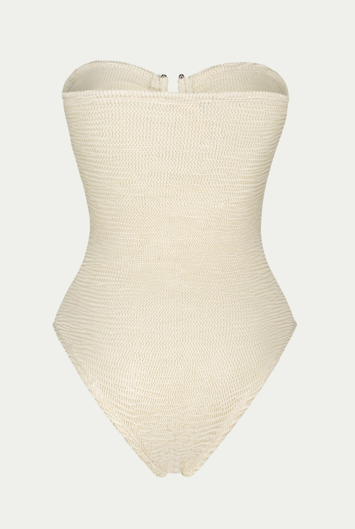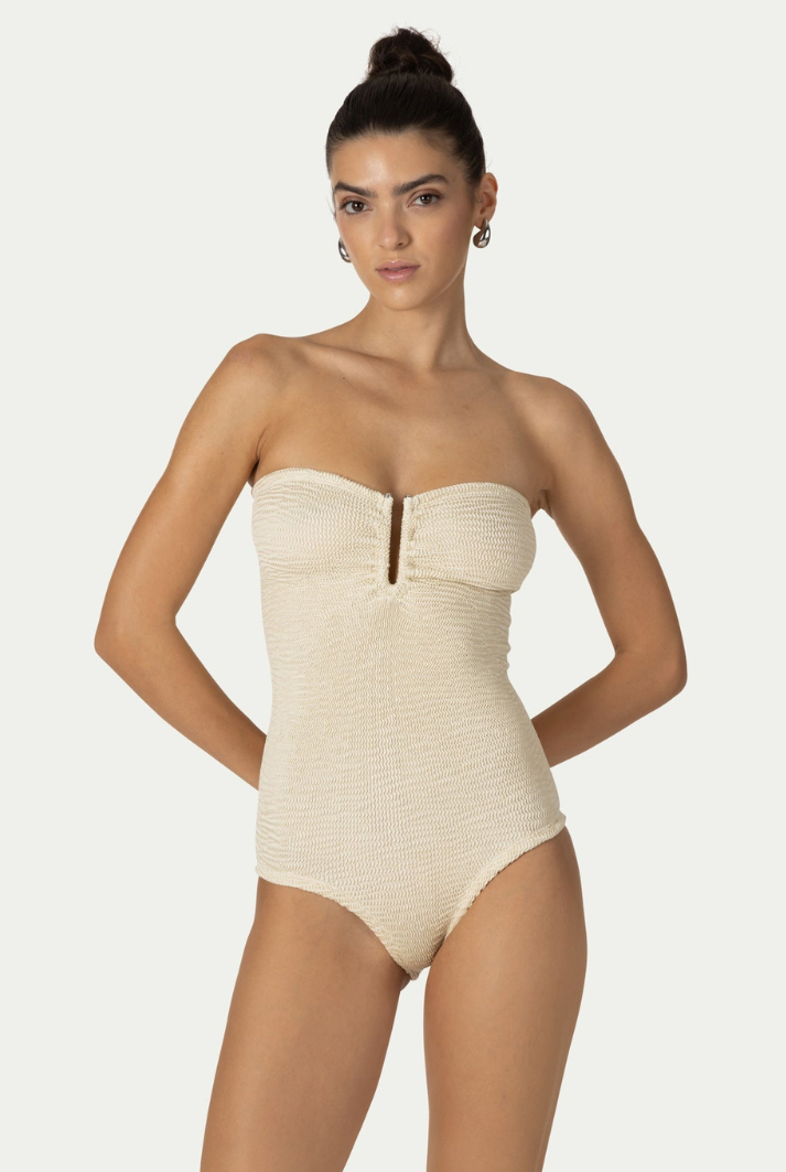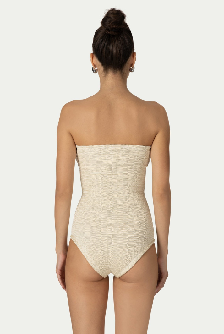 The swimsuit is made of high quality fabric with great elasticity and fits sizes XS to 2XL. The model is strapless, with a cut-out in the middle, accompanied by a metallic accessory and a mid-cut back. One piece FRIDA swimsuit is great for women of all chest sizes and fits great, shaping the body and emphasizing the waist. The cutout in the back of the model has good coverage.