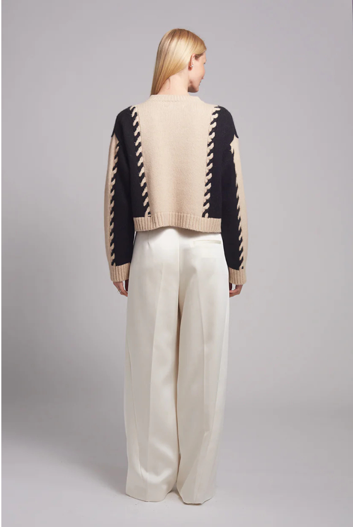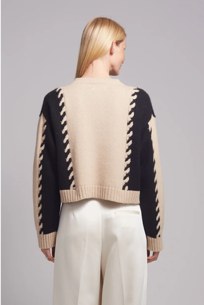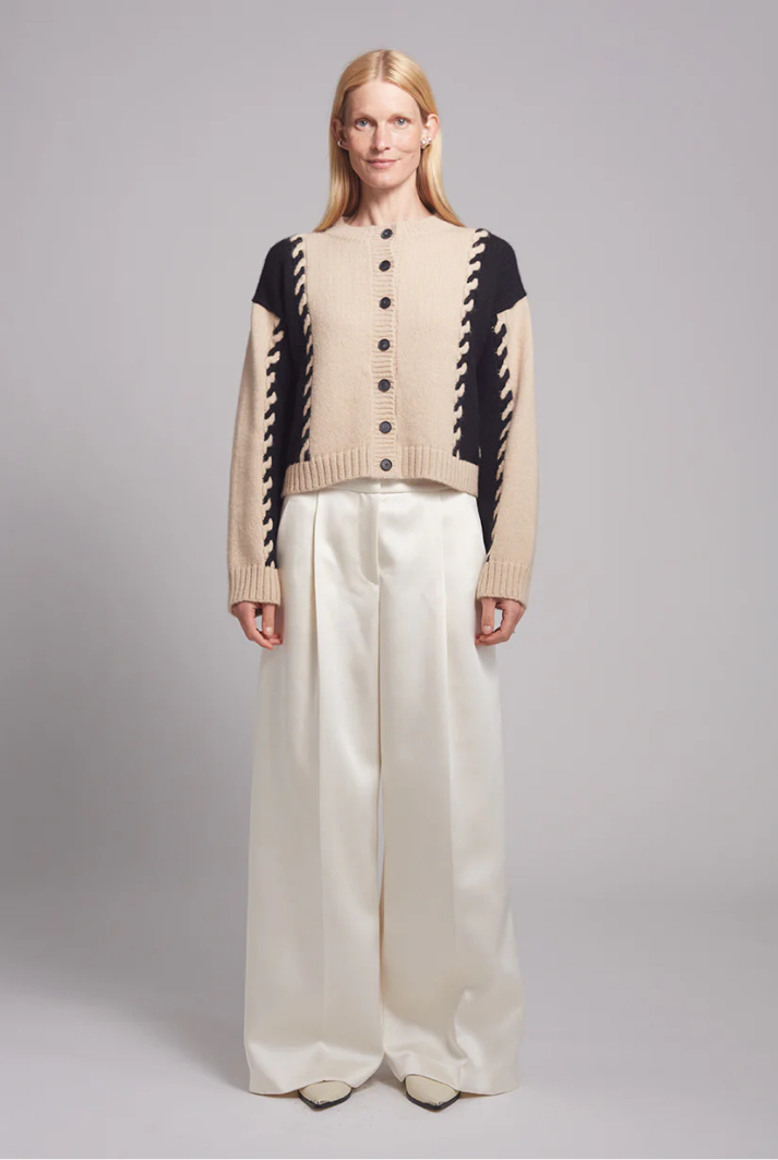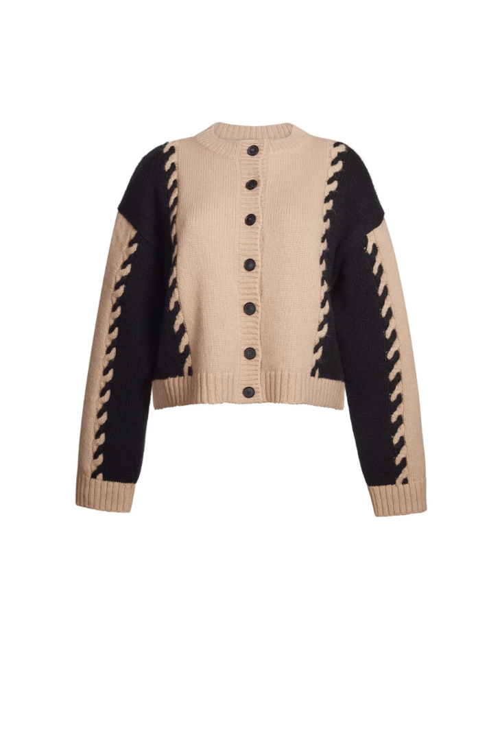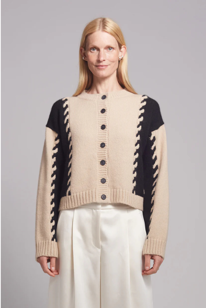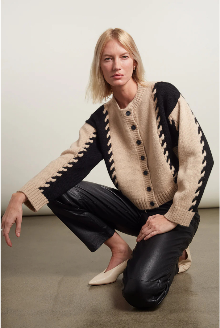The Daria Cardi is a relaxed yet elevated piece. Crafted from ultra-soft, air-spun alpaca yarn, it features bold cabled color-block panels in a timeless neutral palette of pale camel and black. Effortlessly versatile, Daria can be styled casually or dressed up for a more refined look.