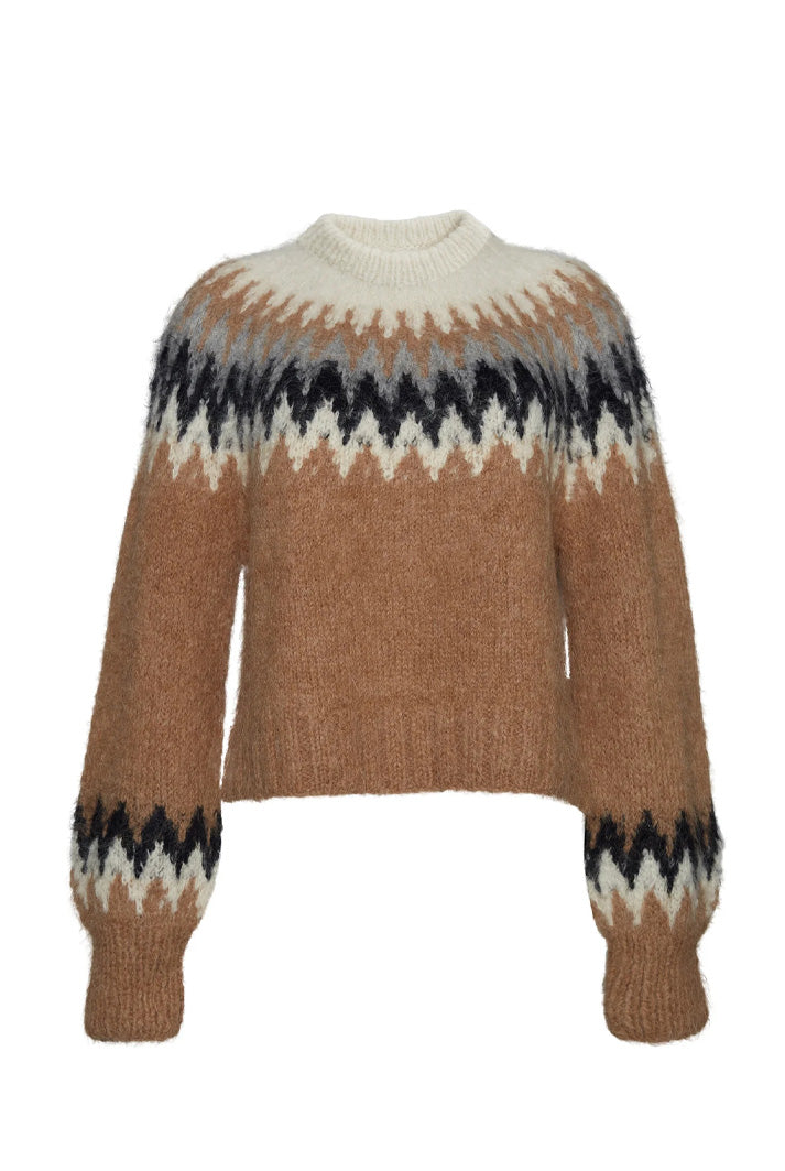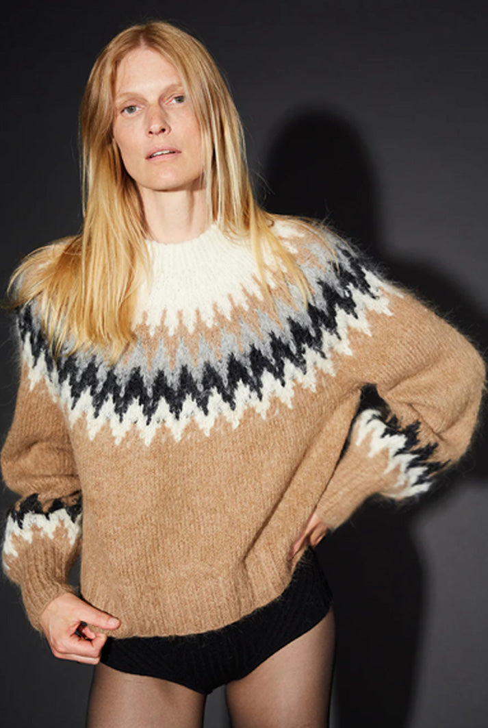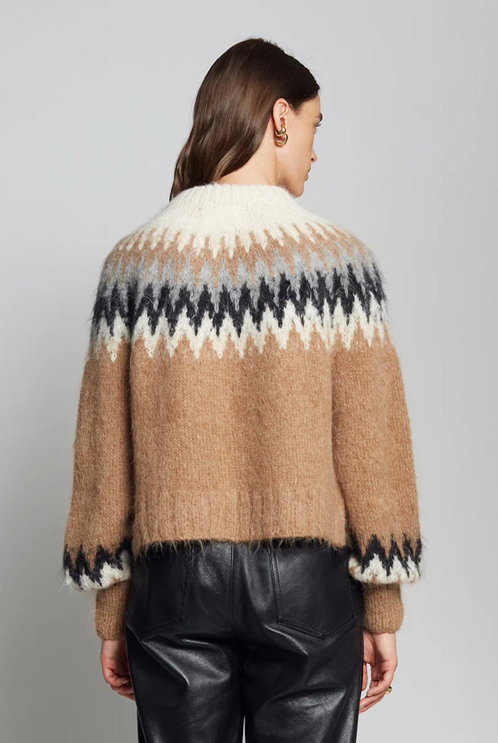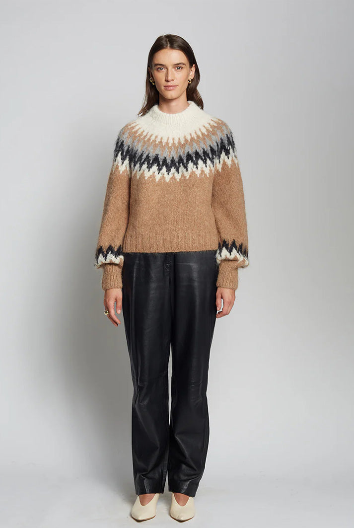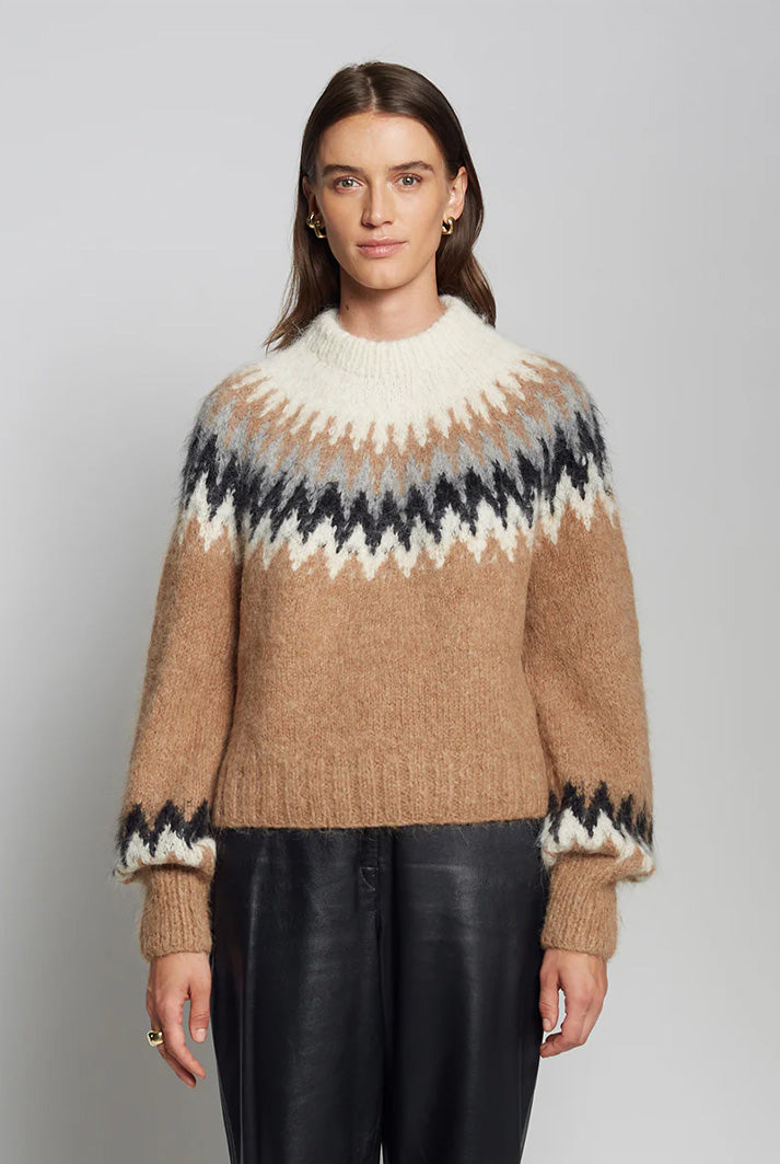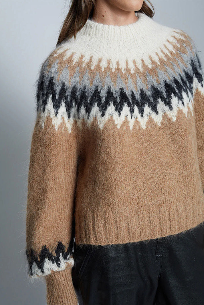Harper is back in a new colorway in this modern twist on an Icelandic, faire-isle patterned sweater. The hand-knit egg-shape, with easy body is made from a longer haired, suri-alpaca and wool blend yarn that you’ll want to cocoon in.