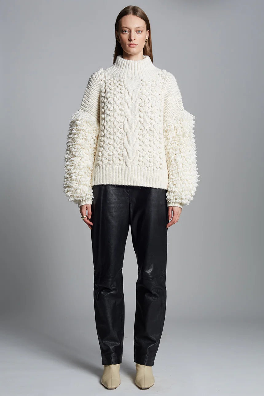 Bella is a textural, novelty sweater to cocoon in. Hand knit with the softest alpaca-blend yarn in sumptuous, chunky, popcorn and cables stitches with dramatic fringed sleeves, this piece is an emotional, feel-good piece that will catch the attention of many.