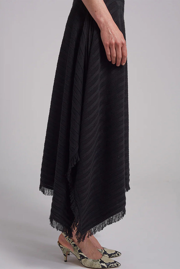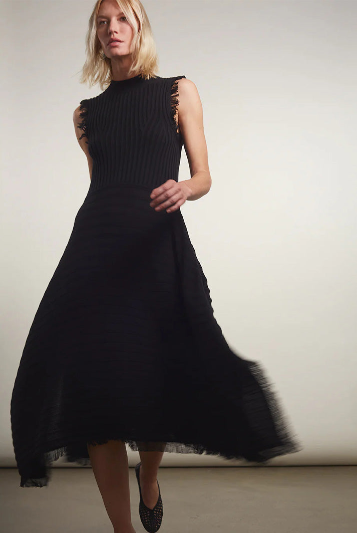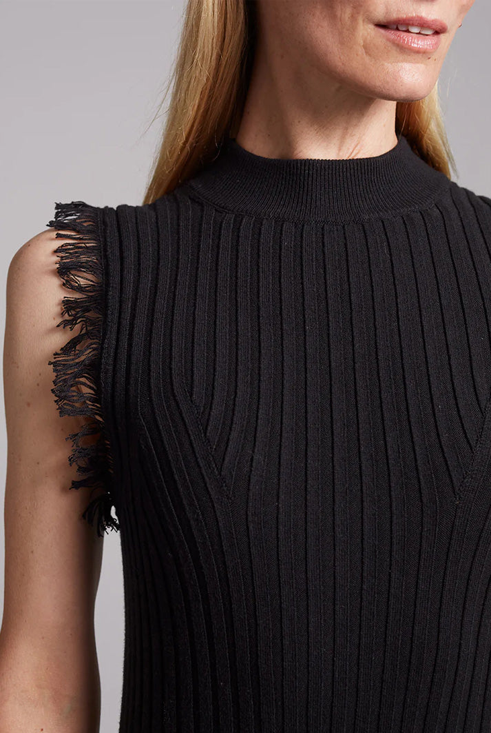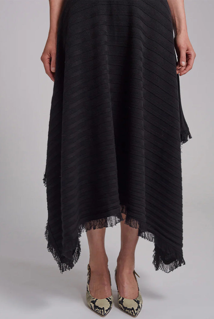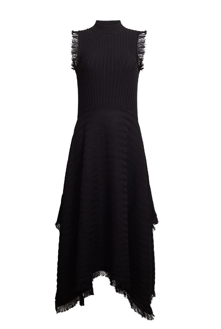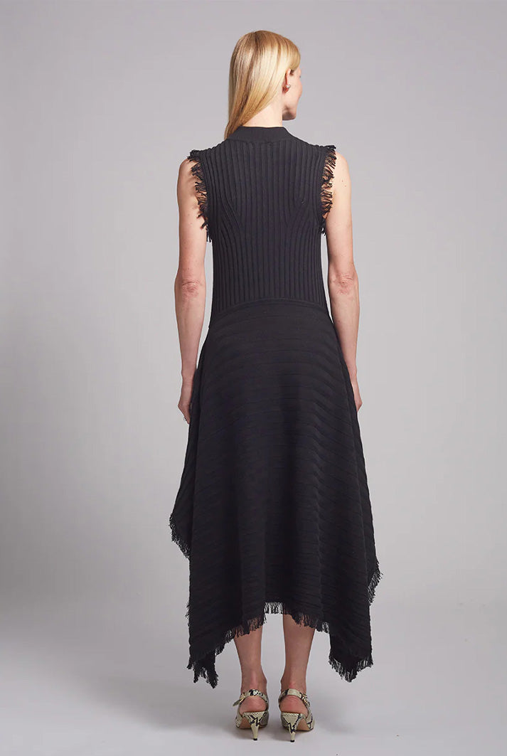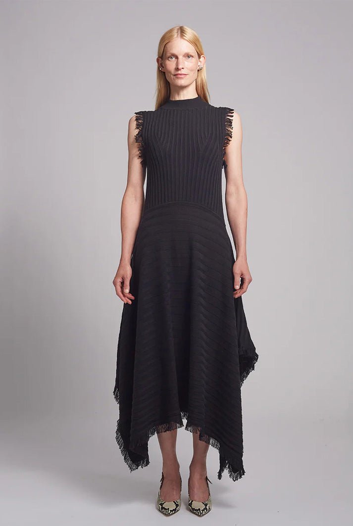 Hanna is a tank dress with mock-neck and a handkerchief hem and fray fringe hem detail that is dressy and dramatic in classic black. The dress is made in a wide flat rib stitch with plaited elastane for recovery. Hanna is a perfect for an occasion or holiday-dressing when you want to be sleek yet effortlessly pop-on-and-go.